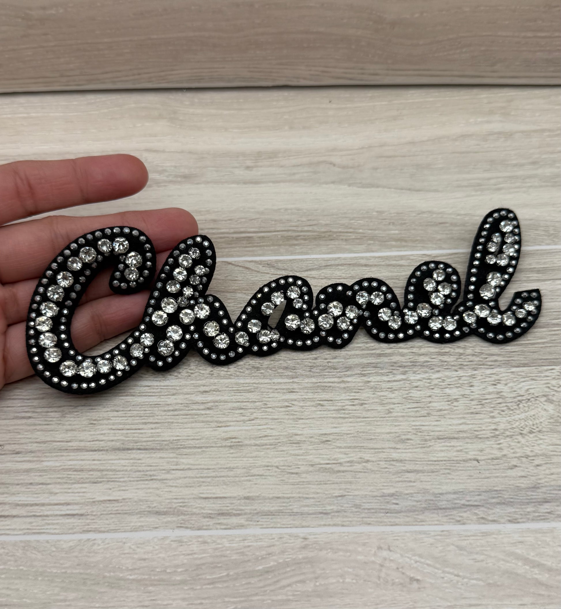 Add sparkle and personality to your custom pieces with this rhinestone script sew-on patch ✨