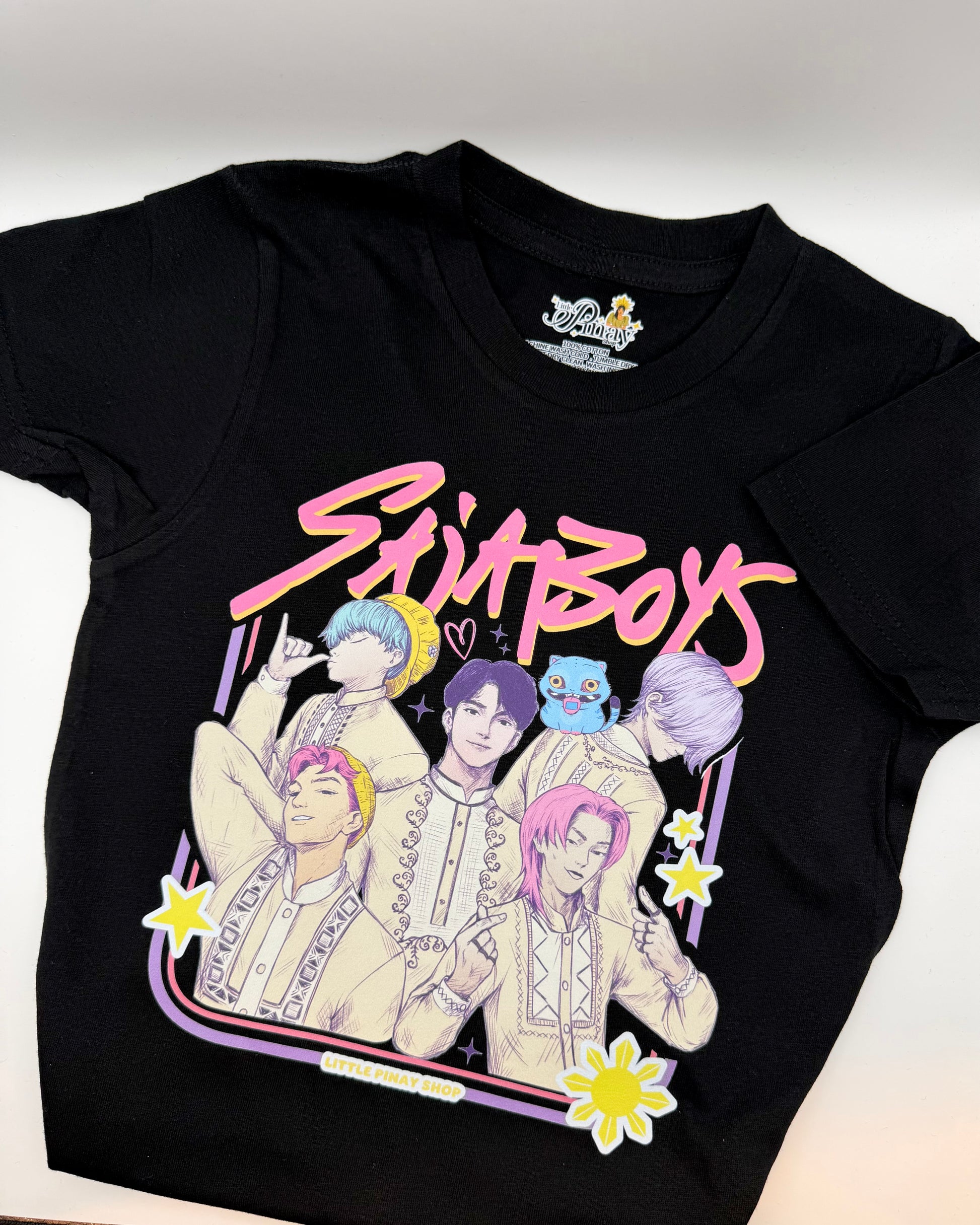 Show off your Pinoy pride with this Saja Boys Barong-Inspired Graphic Tee, featuring a stylish hand-drawn illustration of six characters dressed in modern barong-inspired outfits. Printed on a premium 100% cotton black shirt, this design blends Filipino culture with a fun, aesthetic art style—perfect for fans of cute, anime-style visuals.